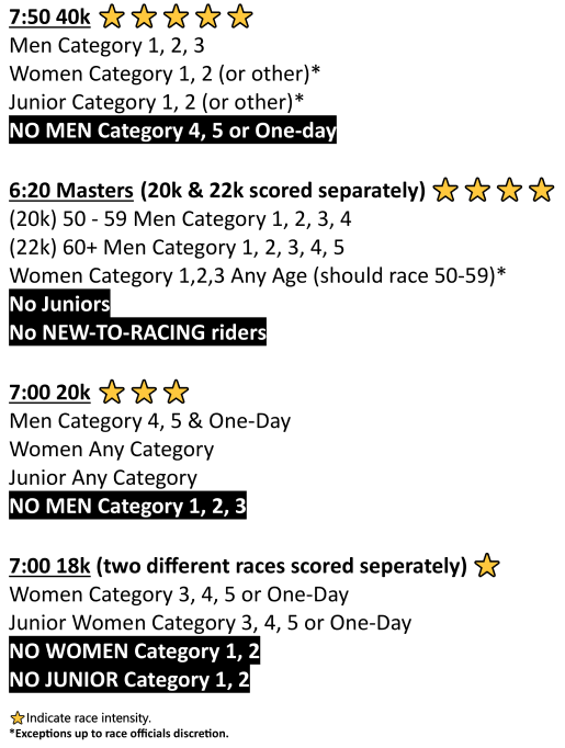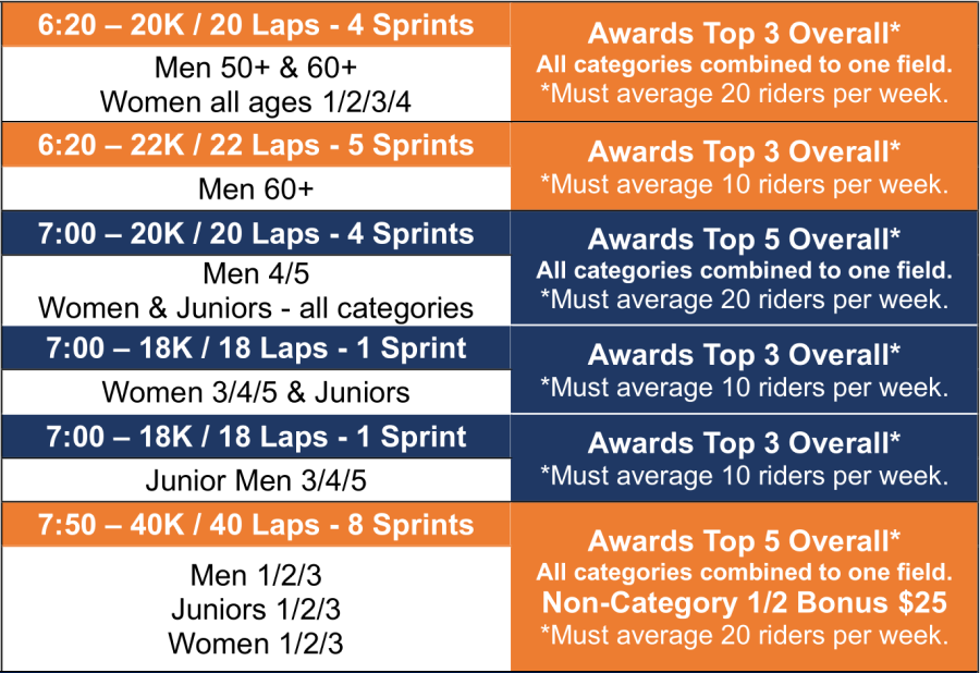 8:00 - 40K Awards five places for all categories combined A “bonus” payout and plaque will go to the highest points earner who is NOT a Men Category 1/2 rider. Only four total riders scored per sprint.