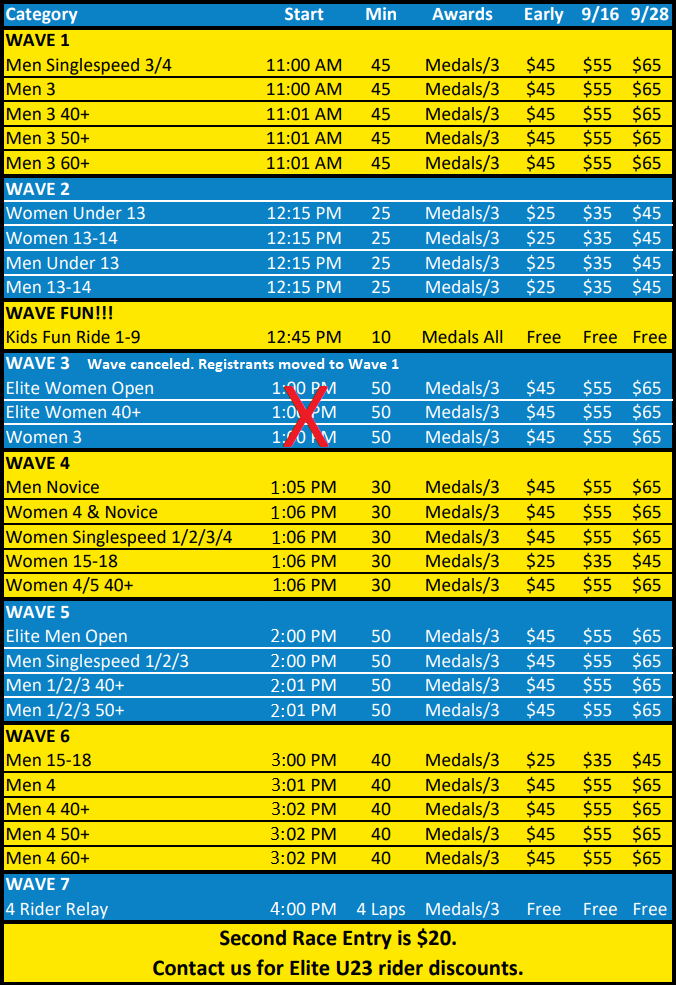 IMPORTANT: The schedule has changed! Due to very low participation numbers across OVCX in the Women Elite and Cat 3 wave, these categories have been moved into Wave 1 (11:00 AM), and Wave 3 has been eliminated. The subsequent waves have been moved forward in time.